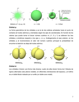 El documento resume los conceptos fundamentales de la geometría molecular, la teoría del enlace químico, la hibridación de orbitales atómicos y la formación de orbitales moleculares. Explica cómo la forma tridimensional de las moléculas depende de la disposición espacial de sus átomos componentes, y cómo la hibridación de orbitales atómicos permite la formación de enlaces químicos con diferentes geometrías. También describe cómo los orbitales atómicos se combinan para formar orbitales moleculares enlazantes