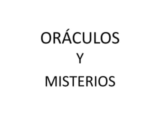 Este documento describe los oráculos y misterios de la antigua Grecia. Explica que los oráculos eran respuestas de deidades a través de sacerdotes como la Pitia de Delfos. El oráculo más importante era el de Delfos dedicado a Apolo. También habla de las religiones mistéricas como los Misterios de Eleusis que celebraban el regreso de Perséfone y permitían la participación de todas las clases sociales. Finalmente, resume los rituales de los misterios menores y mayores de Eleusis.
