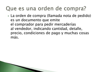El documento describe los elementos clave de una orden de compra, incluyendo la fecha de emisión, los nombres y detalles del comprador y vendedor, los detalles de los productos solicitados, las condiciones de pago y entrega, y la firma del comprador. La orden de compra es un documento emitido por el comprador para solicitar mercancías al vendedor e indicar cantidad, detalles, precio y condiciones.