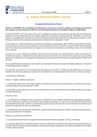Este documento regula la evaluación del alumnado del segundo ciclo de Educación Infantil en la región de Castilla-La Mancha. Establece que la evaluación será global, continua y formativa, con el objetivo de identificar los aprendizajes de los estudiantes y determinar el grado de consecución de los objetivos. Detalla los diferentes tipos de evaluación como la inicial, a lo largo del proceso y la final, así como los procedimientos y documentos de evaluación que incluyen el expediente personal y el historial académico del alumnado.