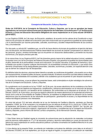 Este documento establece las bases para la concesión de subvenciones para la adquisición de materiales curriculares para alumnos de 1o y 2o de primaria y cursos nuevos de secundaria en Castilla-La Mancha durante el curso 2014-2015. Se destinarán 400.000 euros a subvenciones de 60€ por alumno de primaria y 100€ por alumno de nuevos cursos de secundaria, seleccionados por menor nivel de renta. Los interesados deberán presentar solicitudes telemáticamente junto con justificantes