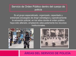 El servicio de orden público dentro del cuerpo de policía se encarga de dirigir estratégica y operativamente la actuación policial cuando el orden público ha sido alterado, empleando los recursos institucionales de manera adecuada. El documento describe las bases legales, principios y funciones del servicio de orden público policial, incluyendo garantizar el derecho a la manifestación pacífica y el uso progresivo de la fuerza cuando sea necesario para restablecer el orden.