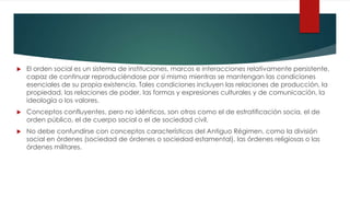 El orden social es un concepto central en ciencias políticas y sociología que se refiere a la estructura social, la jerarquía y las normas aceptadas que mantienen la cohesión en una sociedad. Incluye aspectos como el comportamiento antisocial, la gestión de disfunciones y la interacción entre grupos y redes sociales, así como la estratificación y el estatus. Su estudio abarca distintas teorías sobre su existencia y mantenimiento, which varies from control externo a la internalización de valores y normas.