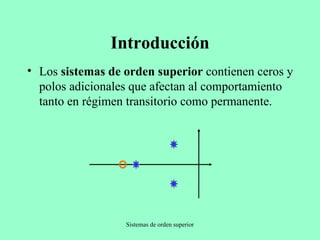 Los sistemas de orden superior contienen polos adicionales que afectan su comportamiento transitorio y permanente. La respuesta transitoria depende de la posición relativa del nuevo polo respecto a los polos complejos. Estos sistemas pueden descomponerse en una combinación de sistemas de primer y segundo orden. En algunos casos, los sistemas de orden superior pueden simplificarse a sistemas de orden inferior mediante la dominancia de polos alejados o la cancelación de pares de polos y ceros próximos.