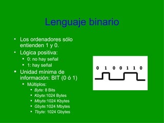 El documento describe los componentes básicos de un ordenador, incluyendo el hardware y el software. El hardware está formado por la placa base, fuente de alimentación, microprocesador, BIOS, memoria, tarjetas de expansión y dispositivos de almacenamiento. El software incluye el sistema operativo, programas de aplicación y lenguajes de programación de alto y bajo nivel.