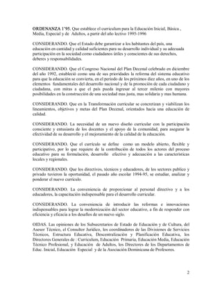 Este documento establece un nuevo currículo para la educación inicial, básica, media, especial y de adultos en la República Dominicana a partir del año escolar 1995-1996. El currículo tiene como objetivo garantizar una educación de calidad para todos los ciudadanos y promover su desarrollo individual y participación en la sociedad. Se define como un modelo flexible, abierto y participativo orientado a satisfacer las necesidades de los estudiantes y la sociedad dominicana.