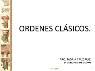 El documento presenta una sesión de la materia Historia de la Arquitectura I sobre los órdenes clásicos de la arquitectura. La sesión incluye información sobre las características, historia y orígenes del orden dórico, jónico y corintio, así como referencias bibliográficas sobre estos estilos arquitectónicos.