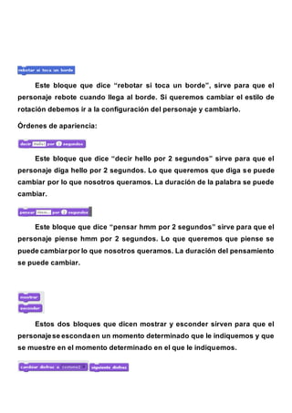 El documento describe los diferentes bloques de comandos en Scratch para controlar el movimiento, apariencia, sonido, eventos, control e interacción del personaje. Algunos bloques permiten mover, girar o cambiar la dirección del personaje, mientras que otros controlan su apariencia al cambiar el disfraz, fondo o tamaño. Bloques adicionales producen sonidos, detectan eventos como presionar banderas o teclas, y contienen instrucciones condicionales o de repetición.