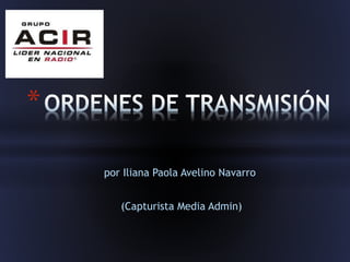 Este documento proporciona instrucciones paso a paso para crear una orden de transmisión en el módulo "Tráfico" del sistema. Explica cómo seleccionar la estación, tipo de programación, producto, versiones, rango de fechas y días de la semana, y generar la orden para que se refleje en el calendario. También cubre detalles adicionales como agregar, editar o borrar partidas, y los diferentes estados que puede tener una orden.