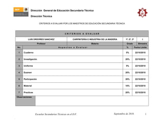 El documento presenta los criterios de evaluación para los maestros de educación secundaria técnica en carpintería e industria de la madera para el primer, segundo y tercer grado. Incluye 7 aspectos a evaluar como cuaderno, investigación, uniforme, examen, participación, material y prácticas, con porcentajes asignados a cada uno y fecha límite del 22 de octubre de 2010.