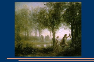 El mito de Orfeo y Eurídice narra el amor entre el hijo de Apolo, Orfeo, y la ninfa de Tracia, Eurídice. Su relación enfrenta complicaciones cuando una víbora interfiere y Orfeo, al intentar rescatar a Eurídice del inframundo, debe cumplir una condición impuesta por Hades. La historia resalta la intriga y las ansias de Orfeo, que llevan a un desenlace trágico.