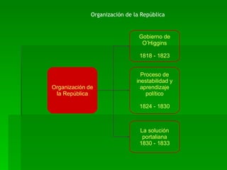 Este documento describe el proceso de organización política de Chile después de su independencia, incluyendo los diferentes gobiernos, constituciones y sectores ideológicos que compitieron por el poder. Explica el gobierno centralista de O'Higgins, los experimentos federales y liberales entre 1824-1830 que llevaron a la inestabilidad, y la solución de Portales en 1830 de establecer un gobierno fuerte y centralizado bajo la Constitución de 1833.