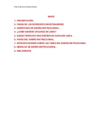 Este documento presenta un resumen de las fases y bases teóricas del diseño instruccional para cursos en línea. Explica que el diseño instruccional implica cinco fases: análisis, diseño, desarrollo, implementación y evaluación. También discute teorías del aprendizaje como conductismo, constructivismo, cognitivismo y conectivismo, y modelos como el de Gagné, que proveen las bases para el diseño efectivo de cursos. El objetivo es proveer conceptos clave para que los estudiantes puedan dise