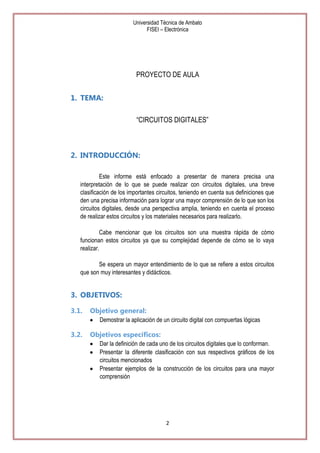Este documento presenta un proyecto de aula sobre circuitos digitales realizado por la Universidad Técnica de Ambato. El proyecto tiene como objetivo demostrar la aplicación de un circuito digital con compuertas lógicas. Se define lo que son los circuitos digitales y se clasifican e ilustran diferentes tipos de circuitos. El proyecto justifica la relevancia de los circuitos digitales y describe el marco teórico de la electrónica y sus ramas.