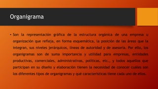 Este documento describe los diferentes tipos de organigramas según su naturaleza, finalidad, ámbito, contenido y presentación gráfica. Explica que los organigramas representan la estructura orgánica de una organización y muestran las líneas de autoridad. Identifica cinco categorías de tipos de organigramas y proporciona ejemplos de cada una.
