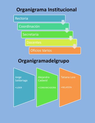 El organigrama institucional incluye a la Rectoría, Coordinación, Secretaría, Docentes y Oficios Varios. Jorge Saldariaga es el líder, Alejandra Cadavid es la comunicadora y Tatiana Lora es la relatora.