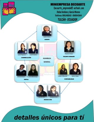 El documento describe los departamentos y responsabilidades de una empresa. La asamblea general toma las decisiones principales y elige a los líderes de los departamentos. La gerencia supervisa el cumplimiento de las actividades de los departamentos de talento humano, ventas, producción, comunicación y contabilidad. Cada departamento tiene funciones específicas como capacitar al personal, vender productos, producirlos, comunicarse internamente y llevar las finanzas.