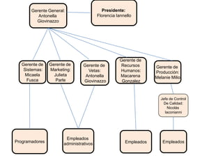 El documento presenta la estructura organizacional de una compañía, con Florencia Iannello como Presidenta, y con Antonella Giovinazzo como Gerente General y Gerente de Ventas. La compañía también tiene gerentes de Recursos Humanos, Sistemas, Marketing, Producción y un Jefe de Control de Calidad, así como empleados administrativos, programadores y otros empleados.