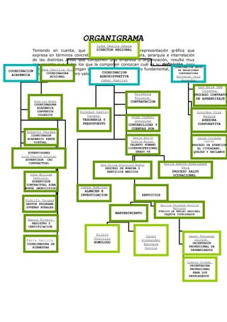 El documento presenta el organigrama del SENA en el Centro Tecnológico de la Amazonia en Florencia, Caquetá. En la parte superior se encuentra la Directora Regional Irma Omaira Amaya y luego las diferentes coordinaciones como la académica, administrativa y de relaciones corporativas. Se detallan los cargos de coordinadores, supervisores, gestores de programas y otros cargos relacionados con las diferentes áreas del SENA.
