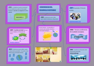 El documento resume las principales conferencias sobre el desarrollo sostenible desde 1992 hasta 2012, incluyendo la Conferencia de la ONU sobre Medio Ambiente y Desarrollo en 1992, la aprobación del Protocolo de Kioto en 1997, y la Conferencia Mundial sobre Desarrollo Sostenible en Johannesburgo en 2001. También menciona conferencias en la UE sobre diversidad biológica y ciudades sostenibles.