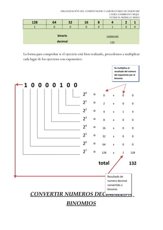 Este documento describe los sistemas de numeración binario, octal y hexadecimal. Explica que el sistema binario utiliza solo dos símbolos (0 y 1) y es el utilizado por las computadoras. También describe cómo convertir números decimales a binarios, octales y hexadecimales agrupando los dígitos binarios. Finalmente, explica que el sistema hexadecimal es más compacto que el binario y cómo realizar conversiones entre estos sistemas.
