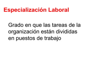 El documento habla sobre conceptos clave relacionados con la estructura organizacional como la especialización laboral, departamentalización, cadena de mandos y centralización. También describe los modelos mecanicista y orgánico, y factores como la estrategia, tamaño, tecnología y entorno que determinan el diseño estructural de una organización. Finalmente, contrasta las diferencias entre grupos y equipos en una organización.