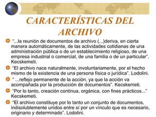 1) El documento describe las características generales de un archivo, incluyendo que surge de manera natural de las actividades cotidianas de una organización y que refleja de forma permanente las acciones de la misma.
