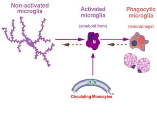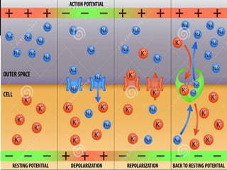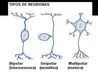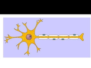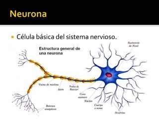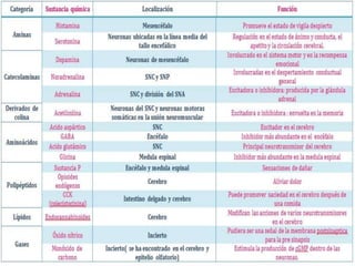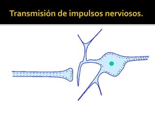 El documento describe las características del sistema nervioso, incluyendo las neuronas y la neuroglia. Las neuronas transmiten señales eléctricas a través de potenciales de acción, mientras que la neuroglia actúa de soporte y protección. La transmisión sináptica entre neuronas implica el uso de neurotransmisores como la acetilcolina y monoaminas.
