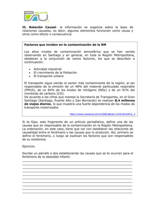 Este documento presenta cinco formas principales de organizar la información en un texto: 1) Secuencia temporal, ordenando los eventos de acuerdo a su orden cronológico; 2) Relación causal, estableciendo causas y efectos; 3) Comparación, contrastando semejanzas y diferencias; 4) Problema-solución, presentando problemas y posibles soluciones; y 5) Enumeración descriptiva, describiendo características de un tema. El objetivo es presentar la información de manera clara y coherente según el tipo de texto.