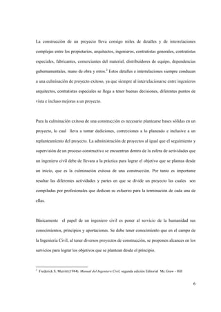 El documento describe los conceptos clave de la programación de proyectos y el proceso constructivo. Explica que un proyecto involucra una serie de actividades interrelacionadas para lograr un objetivo específico utilizando recursos de manera eficiente. También describe los factores funcionales y la organización típica de una empresa constructora, así como la importancia de planificar un proyecto antes de su ejecución.