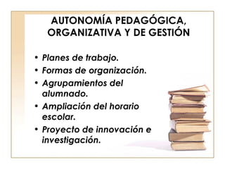 El documento describe la organización y gestión de los centros educativos en Andalucía. Establece que los centros gozarán de autonomía pedagógica, organizativa y de gestión a través de su Plan de Centro, que incluye el Proyecto Educativo, el Reglamento de Organización y Funcionamiento, y el Proyecto de Gestión. Asimismo, detalla la estructura de gobierno de los centros y los distintos órganos colegiados participativos de la comunidad educativa.