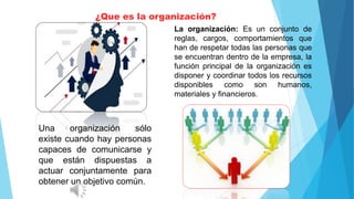 Este documento describe los conceptos clave de la organización. En resumen: (1) Una organización existe cuando hay personas que actúan juntas para lograr un objetivo común, (2) La organización coordina los recursos humanos, materiales y financieros para alcanzar metas, (3) Principios como la división del trabajo, jerarquización y departamentalización son fundamentales para una organización efectiva.