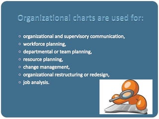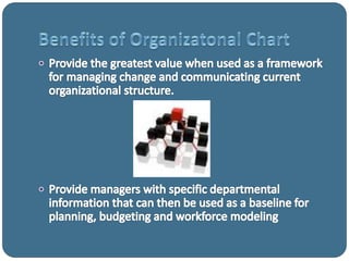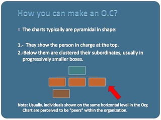 El documento presenta un organigrama de una organización con Gabriel Guzman Romero como Gerente General. Reportan directamente a él el Gerente Administrativo y el Jefe de Recursos Humanos. El Gerente Administrativo supervisa al Cajero, Chef Ejecutivo y otros roles. El Chef Ejecutivo supervisa roles como Chef de Partie y Commis.