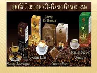 Este documento promueve los beneficios de tomar café Organo Gold y unirse a su negocio de ventas directas. Resalta que el café contiene hongos ganoderma que ofrecen muchos beneficios para la salud y que se puede ganar dinero vendiendo el café y reclutando a otros. También describe varios productos de café como el latte y el moca y los beneficios del hongo ganoderma para la salud.