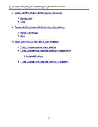 El documento es una guía sobre la anatomía microscópica de los órganos linforeticulares, destinada a estudiantes del decanato de ciencias de la salud en UCLA. Describe la estructura histológica de estos órganos, enfatizando el timo y sus funciones en la diferenciación de linfocitos T, así como los procesos de selección positiva y negativa. También se menciona la involución del timo y su papel como órgano endocrino en la regulación del sistema inmunológico.