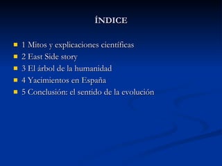 Este documento resume las principales teorías sobre el origen de la especie humana. Explica que la teoría científica actual es que los humanos evolucionaron de ancestros primates en África oriental hace entre 4 y 6 millones de años. Describe los principales hitos evolutivos como el bipedalismo, el desarrollo del cerebro y el lenguaje. También menciona importantes yacimientos fósiles en España como Atapuerca que han arrojado luz sobre especies humanas antiguas como Homo antecessor.