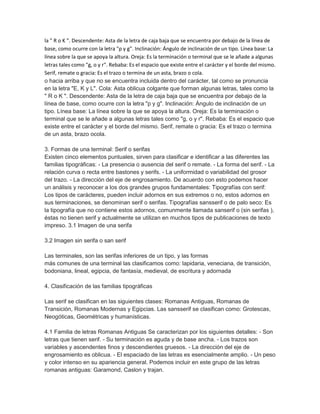 Este documento trata sobre los orígenes y definiciones de la tipografía. Explica que la tipografía es el arte y técnica del manejo y selección de tipos para crear trabajos de impresión. Se define la tipografía como el arte de disponer correctamente el material de imprimir para transmitir con habilidad, elegancia y eficacia las palabras impresas. También describe las diferentes partes que componen un tipo y clasifica las diferentes familias tipográficas como romanas antiguas, romanas de transición, romanas modernas, egipcias, grotescas