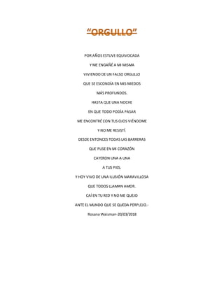 La autora vivía engañada por un falso orgullo y miedos profundos. Una noche, al encontrarse con la mirada de alguien, no pudo resistirse y cayeron todas las barreras de su corazón. Ahora vive una maravillosa ilusión que todos llaman amor, cayó en la red de esa persona y no se queja ante un mundo perplejo.