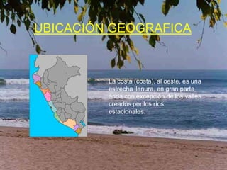 La costa peruana se caracteriza por ser estrecha y árida, excepto en los valles de los ríos estacionales. Incluye el Desierto de Sechura y el pueblo de pescadores de Huanchaco. El clima es templado con temperaturas entre 14°C y 27°C. La selva peruana se divide en selva alta y baja. Contiene importantes ríos como el Amazonas, Marañón y Ucayali. El clima es subtropical con lluvias entre noviembre y marzo. Alberga una rica flora