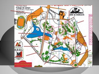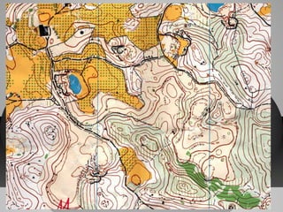 El documento proporciona información sobre la orientación deportiva. Explica que los corredores visitan puntos marcados en un mapa y una brújula para encontrar el camino más rápido, describe los elementos de un mapa como las curvas de nivel y la escala, y explica cómo usar una brújula para determinar la dirección.