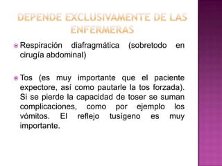 Este documento describe la orientación y preparación preoperatoria de los pacientes. Se enfatiza la importancia de la respiración diafragmática, tos y ejercicios de las extremidades inferiores para prevenir complicaciones. También se discute el control del dolor preoperatorio y la distinción entre orientación y preparación. La preparación incluye la alimentación, eliminación, higiene, apoyo psicológico y la identificación de factores de riesgo como infección, déficit nutricional y obesidad.