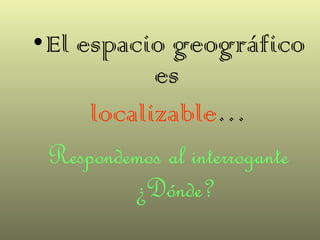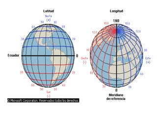 Este documento describe los conceptos de orientación, localización y los sistemas de coordenadas geográficas. Explica que la orientación implica ubicarse teniendo en cuenta los puntos cardinales, mientras que la localización permite establecer el lugar exacto. Describe los sistemas de localización relativa e absoluta y el sistema de coordenadas geográficas basado en paralelos y meridianos, incluyendo el Ecuador, meridiano de Greenwich y hemisferios. Finalmente, define latitud y longitud, sus unidades de medida y cómo se usan par
