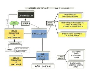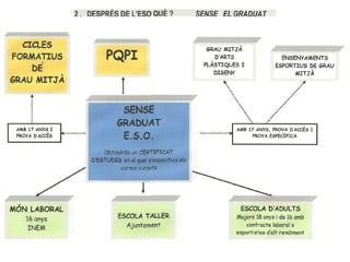 Este documento ofrece una orientación vocacional a los estudiantes de 3o de la ESO. Explica los requisitos de promoción a 4o ESO, las opciones de materias en 4o ESO, y las opciones disponibles al finalizar 4o ESO, incluyendo Bachillerato, Ciclos Formativos de Grado Medio y Superior, y el mundo laboral. También proporciona información sobre las pruebas de acceso a los Ciclos Formativos y los detalles de algunos Ciclos Formativos ofrecidos en la zona.