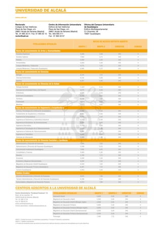 Este documento proporciona las notas de corte para el acceso a las titulaciones universitarias oficiales de la Comunidad de Madrid para el curso 2014-2015. Presenta las notas de acceso para dos grupos distintos (pruebas de acceso y titulados) de diversas titulaciones agrupadas por ramas de conocimiento. Además, incluye información sobre los créditos y cursos de cada titulación.