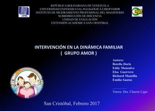 Este documento trata sobre la intervención en la dinámica familiar a través de la orientación familiar. Explica que la orientación familiar busca promover el bienestar de la familia y prevenir situaciones problemáticas. También describe varios modelos y técnicas empleados en la orientación familiar como el genograma, ecograma, y modelos psicoanalítico, cognitivo-conductual y sistémico. Finalmente, discute las implicaciones éticas de la función orientadora del docente.