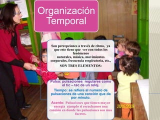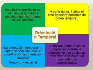 Este documento presenta las nociones temporales básicas que se enseñan a niños en edad preescolar, incluyendo conceptos como antes/después, días de la semana, meses, estaciones, y horas. Explica que los niños aprenden a fijar eventos en el tiempo a través de actividades diarias como comer y jugar. También cubre la orientación temporal mediante preguntas sobre la fecha, día y hora actuales, así como el razonamiento temporal para inferir actividades basadas en indicaciones temporales como fechas especiales.