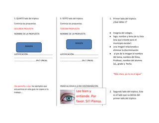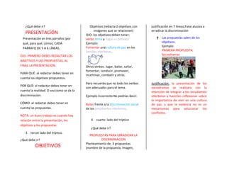 El documento proporciona instrucciones para crear un tríptico sobre la eliminación de la discriminación. Indica que el tríptico debe contener una presentación, objetivos y tres propuestas. La presentación debe tener tres párrafos explicando por qué, para qué y cómo se abordará el tema. Los objetivos deben estar formulados con verbos y describir el contexto. Las propuestas deben nombrarse, justificarse en 7 líneas e incluir una frase sobre la erradicación de la discriminación.
