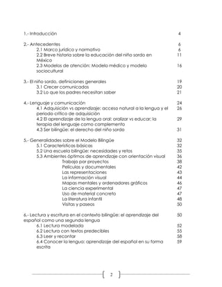 Este documento brinda orientaciones para la atención educativa de alumnos sordos en educación básica desde un enfoque bilingüe. Explica la importancia de reconocer las necesidades lingüísticas y comunicativas particulares de los estudiantes sordos y de proveer educación bilingüe en lengua de señas y español que garantice el desarrollo pleno del lenguaje y la inclusión educativa. También resalta la necesidad de contar con maestros competentes en lengua de señas y de crear ambient