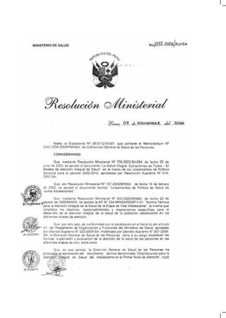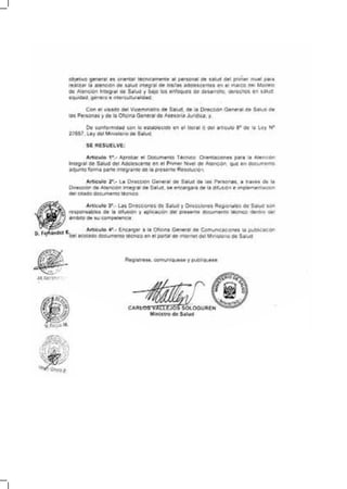 Este documento técnico del Ministerio de Salud de Perú proporciona orientaciones para la atención integral de salud de los adolescentes en el primer nivel de atención. Presenta el marco conceptual del Modelo de Atención Integral de Salud y estrategias para la organización y provisión de servicios diferenciados para adolescentes, incluyendo evaluaciones integrales, planes de atención individualizados, y intervenciones preventivas y promocionales. El objetivo es mejorar la calidad de vida de los adolescentes a través de un enfoque de derechos, equidad y