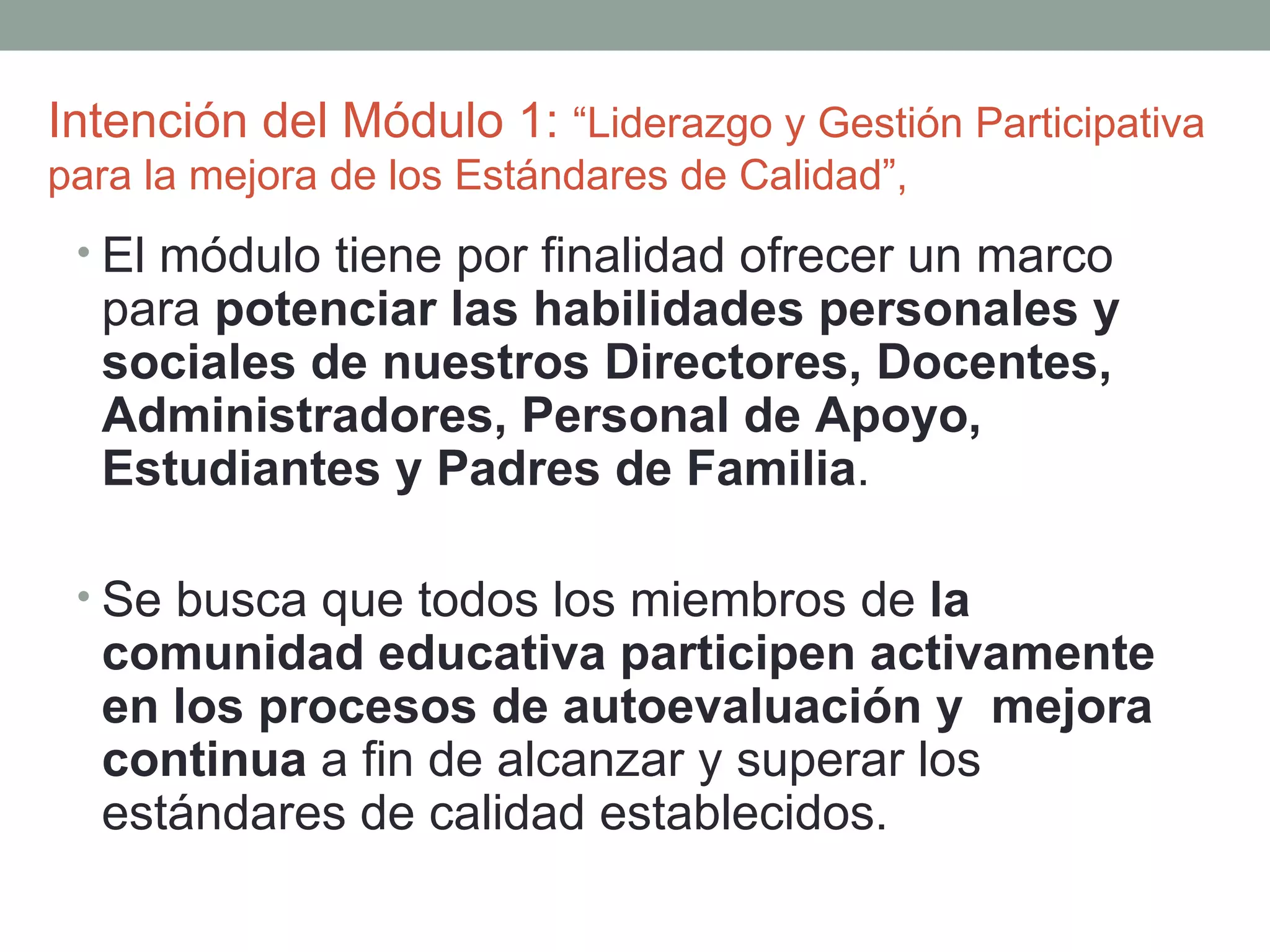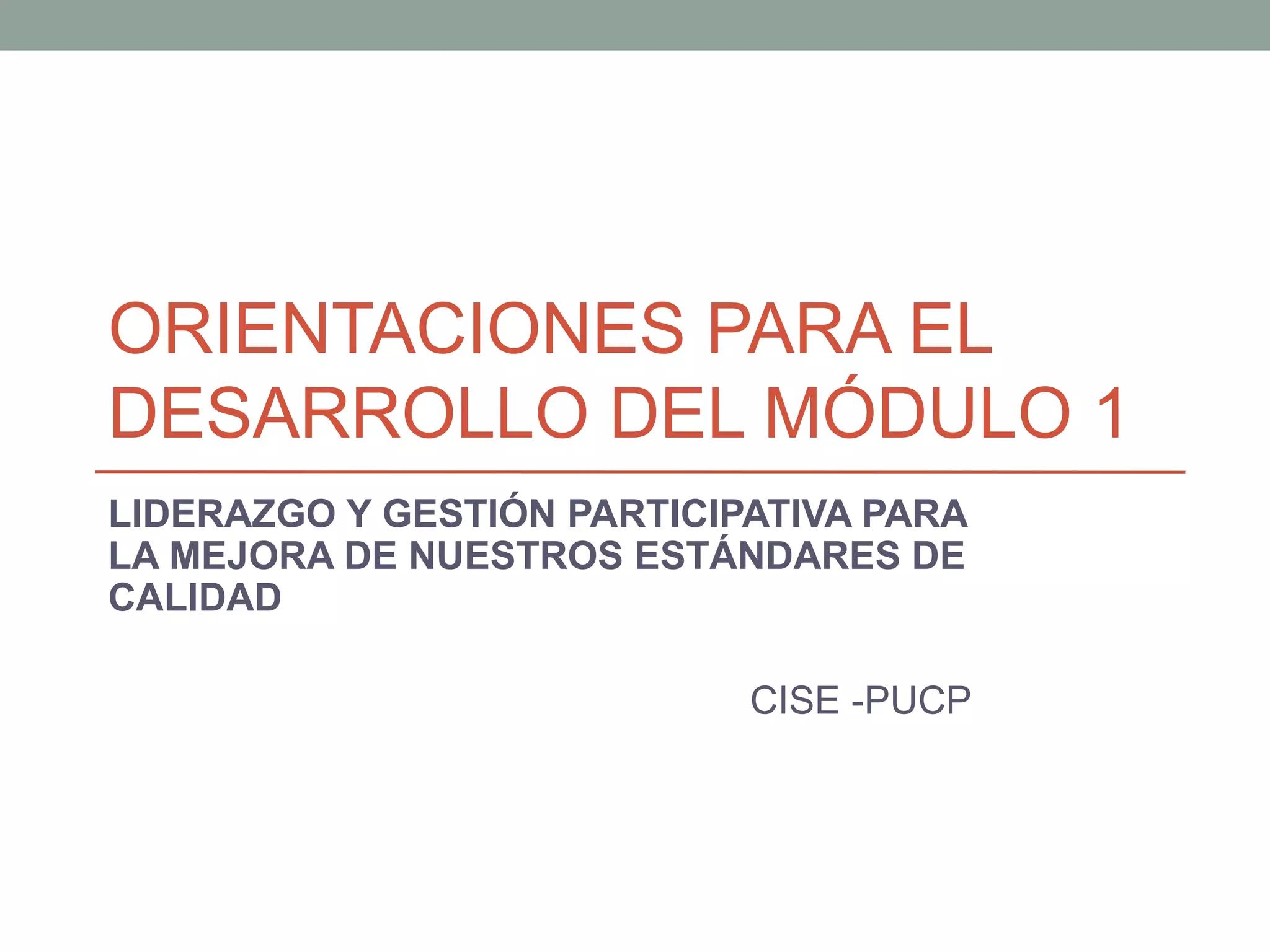 Este documento presenta las orientaciones para el desarrollo del Módulo 1 sobre Liderazgo y Gestión Participativa para mejorar los estándares de calidad. El módulo busca potenciar las habilidades de liderazgo y gestión de la comunidad educativa para que participen activamente en la autoevaluación y mejora continua. El objetivo es alcanzar los estándares de calidad mediante 7 capítulos que abordan temas como el desarrollo personal, la comunicación, la participación a nivel institucional de entidades como el CONEI,
